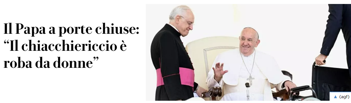 Di qualche ora fa è la notizia, per niente smentita dal Vaticano, che riporta le parole di Papa Francesco rivolte ai vescovi italiani. Sono queste: “Il chiacchiericcio è una roba da donne. Noi abbiamo i pantaloni, dobbiamo dire le cose”. Si tratta di un mix di luoghi comuni e sessismo, che non vengono dal bar sotto casa, ma dal capo della Chiesa Cattolica che conta oltre un miliardo di fedeli. Non c’è male.